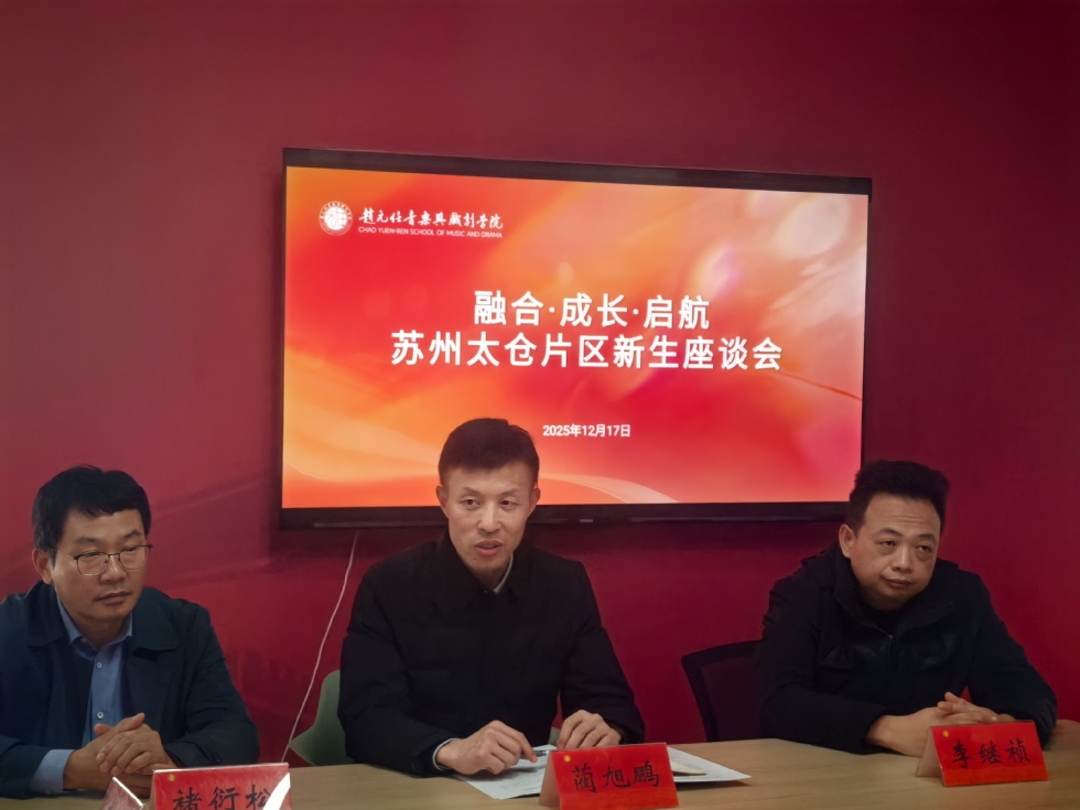 为促进新生尽快融入大学校园,助力学子成长,搭建师生沟通桥梁,12月17日下午,赵元任音乐与戏剧学院在西太湖校区研习书苑举办了“融合·成长·启航——太仓招生片区新生座谈会”。学生处副处长蔺旭鹏,院党委副书记褚衍松,院招生工作教师李继祯,院辅导员李思琦、罗扶摇以及来自各学院12名太仓籍新生代表参会。会议由李思琦主持。