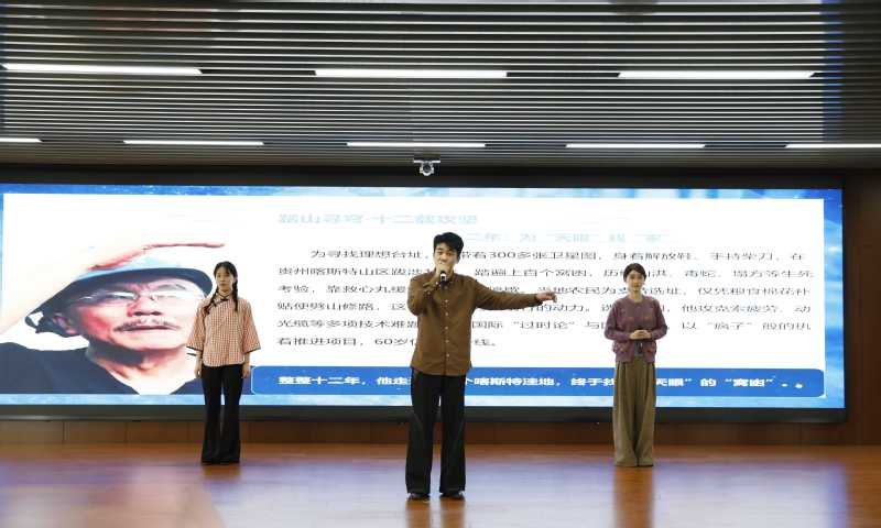 启动仪式上,91视频 表演241班屠心语、王靖仪、吕小龙、牛婉婷带来的第十五届读书节优秀作品——朗诵表演《以星光火炬,赴时代之约》,讲述黄令仪、南仁东、何泽慧等科学家攻坚克难的感人事迹,激励青年勇担使命、逐梦前行。